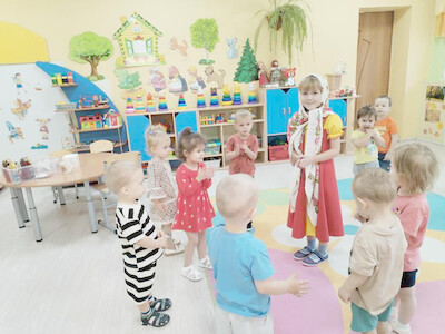 День был наполнен весельем, творчеством и, конечно, игрой. Все началось с удивительной истории. Воспитатель группы Чуклова Екатерина Юрьевна показала детям большую расписную матрешку и рассказала о ней интересную сказку.
